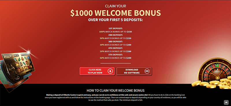As you register on the Villento online casino gaming site, you get access to unlimited fun and get a sign-up bonus for it of $1,000. These Villento Casino Rewards are termed as deposits bonus and categorized into match bonuses for the first 5 deposits, such as: