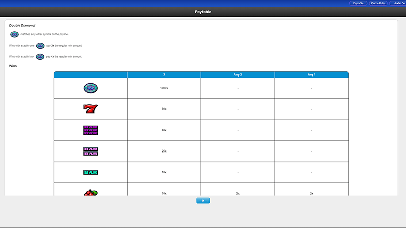 Before looking to wager, it is very important for a player to get to know the kind of icons used on the paylines and their respective payouts. As the Double Diamond slot is a takeoff of the classic Vegas land-based fruit machine, you will not find any of the big or high-quality and